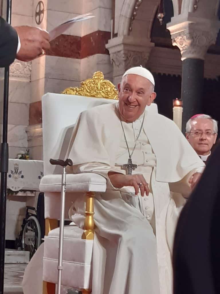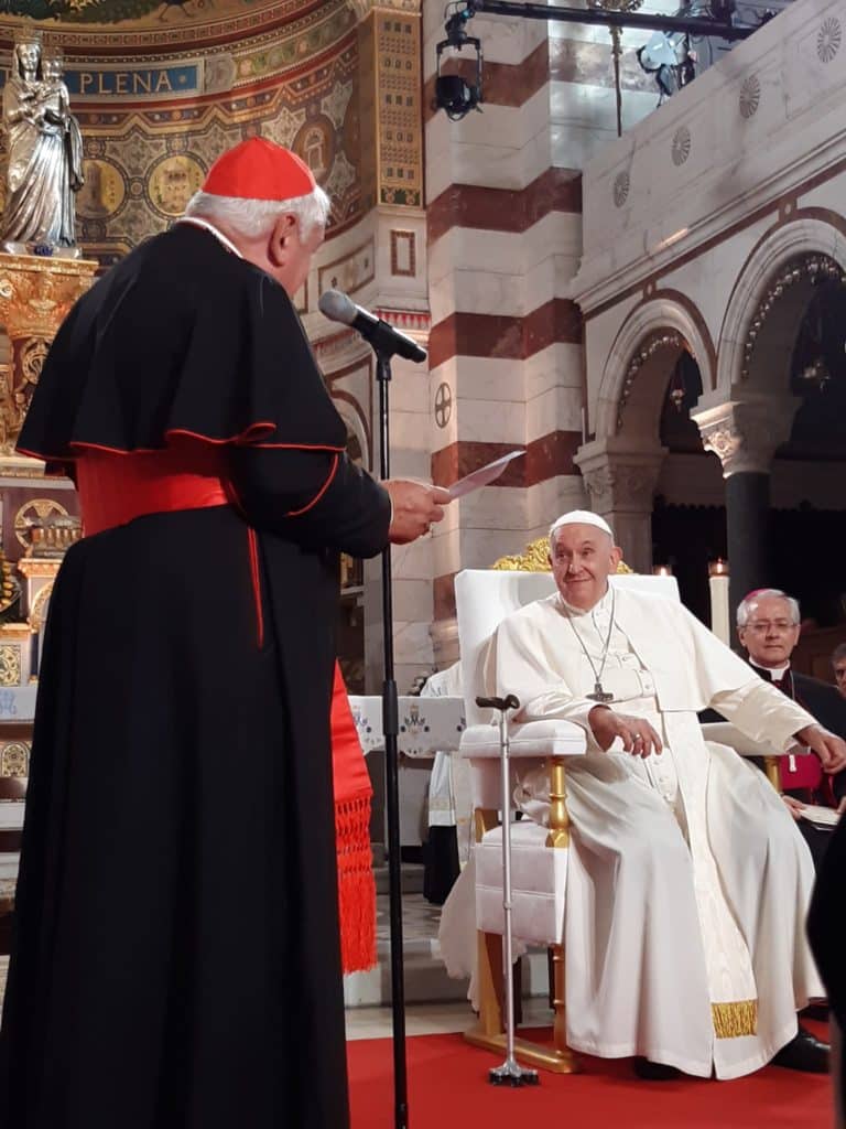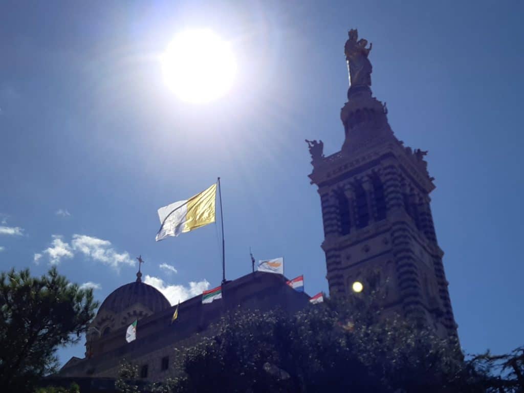 Premier rendez-vous : les responsables de communauté à Notre Dame de la Garde pour accueillir le pape, juste après madame la ministre. Sr Claire Marie et sr Marie Germaine sont très proches et prennent les meilleures photos. En effet, Mgr Aveline, avec la délicatesse et l’humour qu’on lui connait accueille le pape François : « Comme tout bon Marseillais, vous êtes monté à ND de la garde. D’autres saints vous ont précédé »… François interrompt le mot d’accueil : » Sauf que moi, je suis pécheur !! » 🙂 Quelle belle complicité !