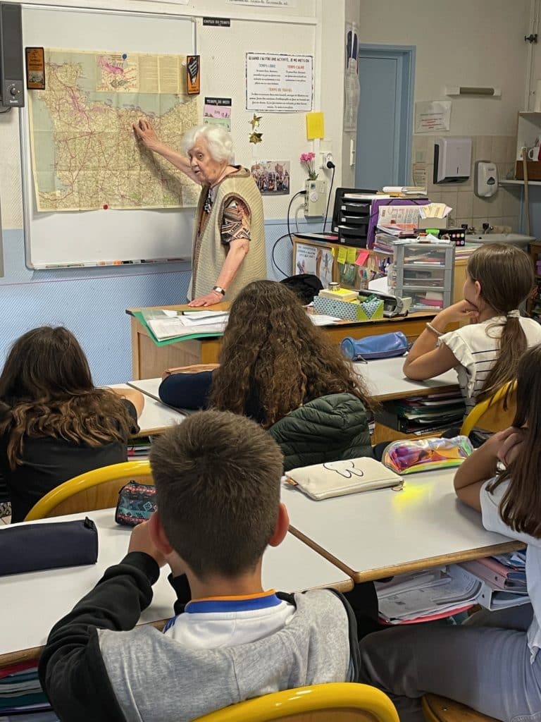 Madame Taurel, qui avait 14 ans au moment du débarquement, est venue raconter aux CM2 ses souvenirs de la bataille de Normandie. Les enfants étaient suspendus à ses lèvres, lorsqu’elle leur décrivait précisément ses impressions de l’époque, les images qu’elle a gardées en mémoire, les odeurs ou les bruits qu’elle n’oubliera jamais…